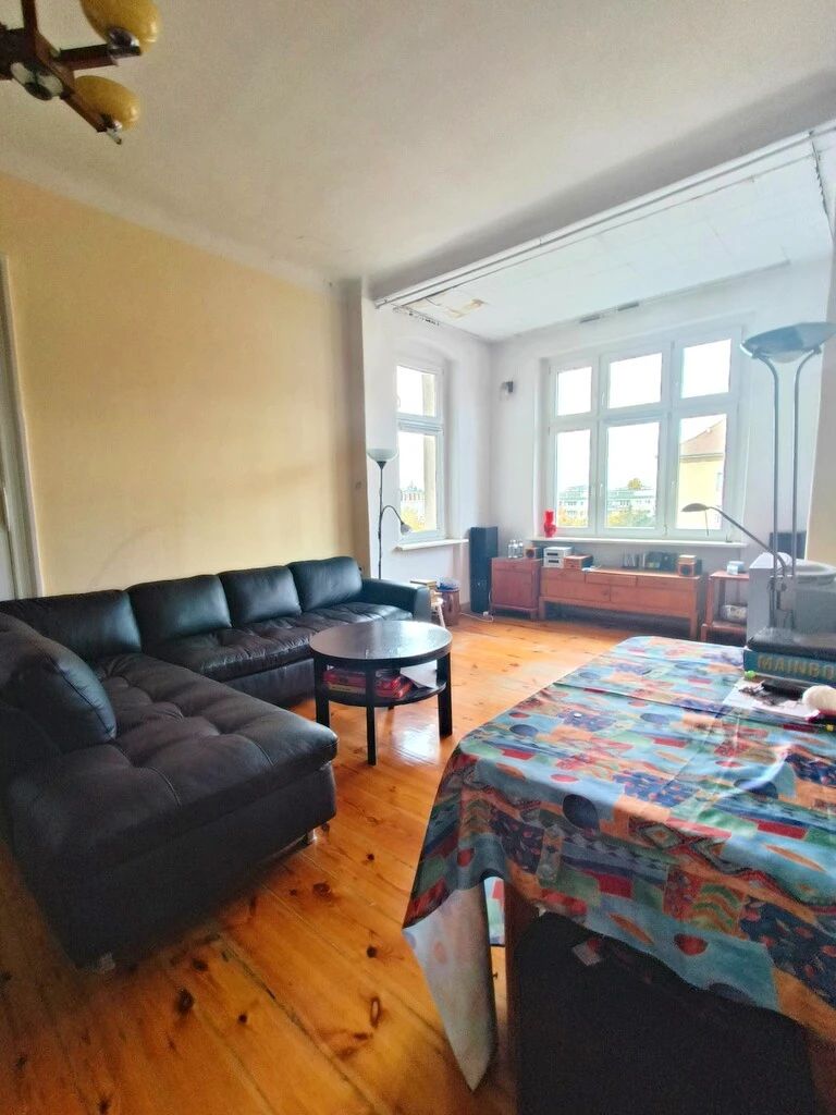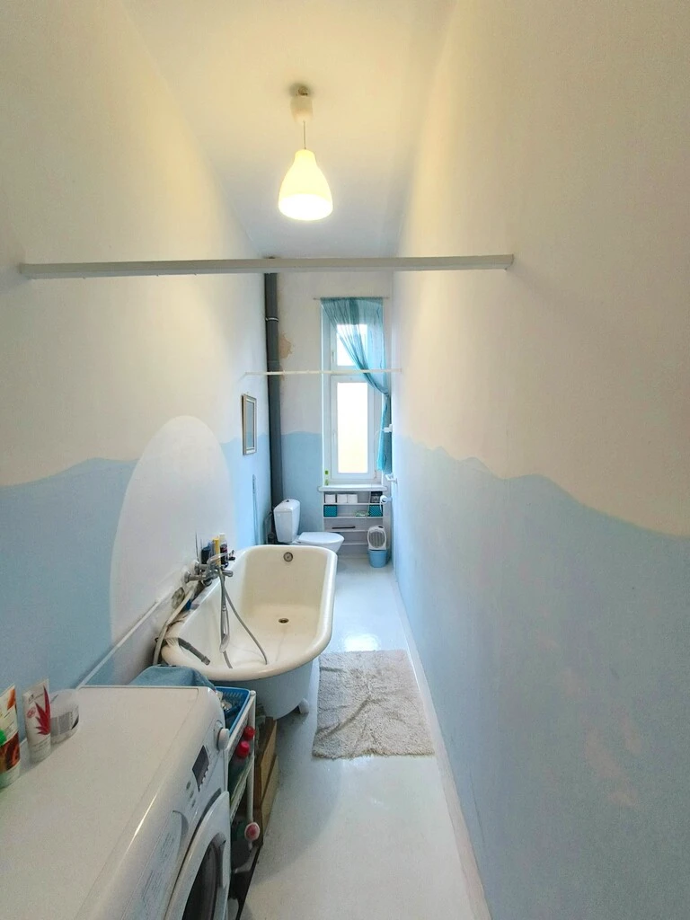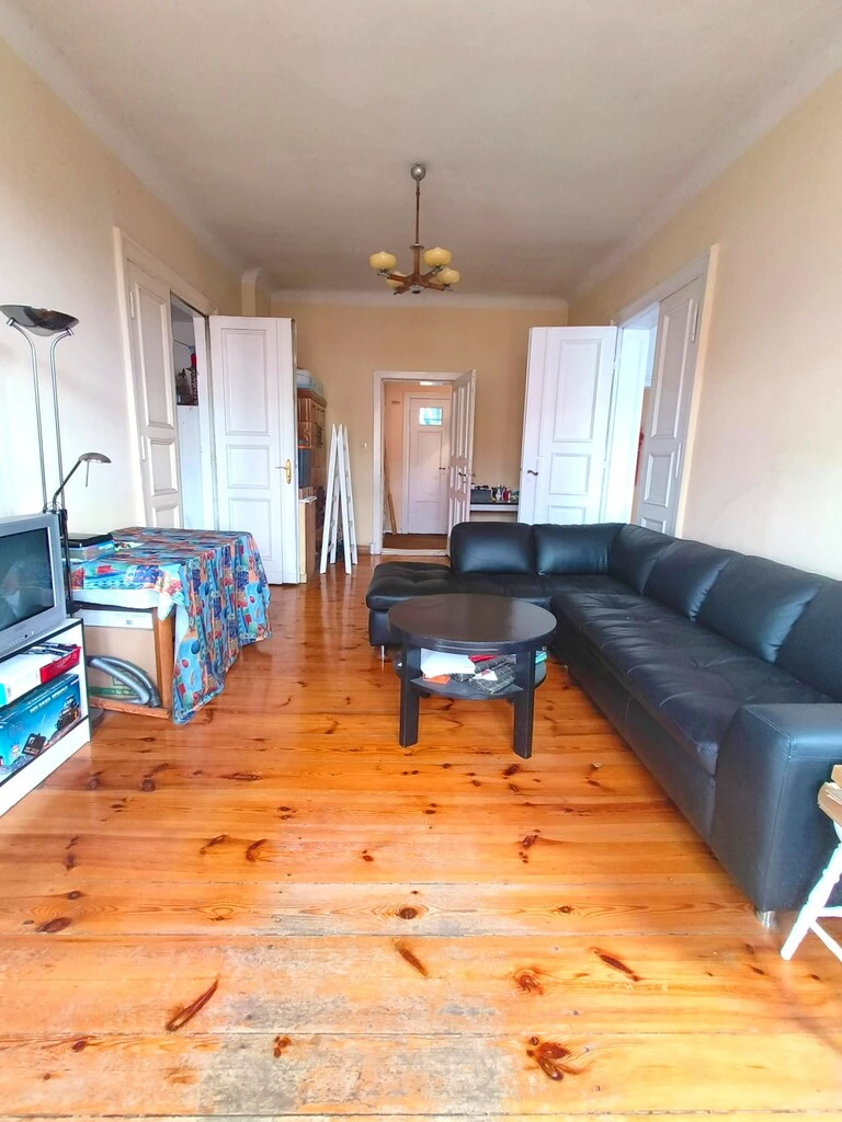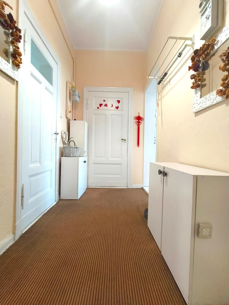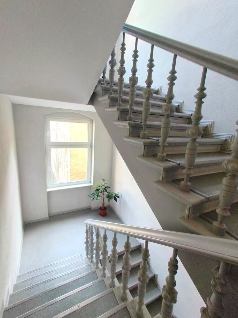Die Wohnung befindet sich in einer soliden Altbaukonstruktion aus dem Jahr 1945 und überzeugt mit ihrer klassischen Architektur, hohen Decken und großen Fenstern, die ganztägig ein angenehmes Tageslicht bieten. Die allgemeine Gebäudesubstanz ist gut gepflegt, das Treppenhaus wurde renoviert und bietet breite, saubere Verkehrsflächen.