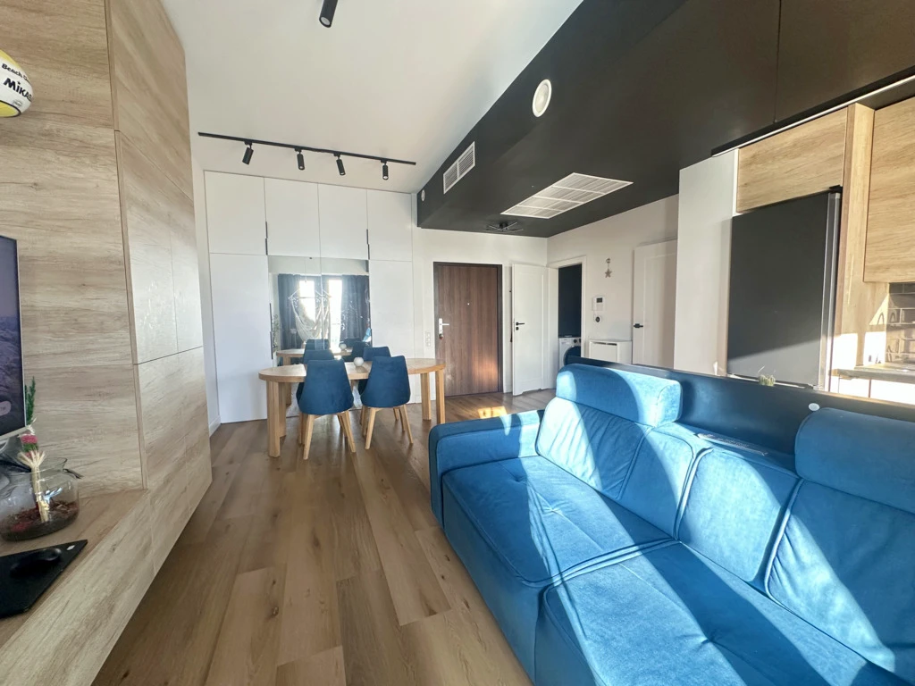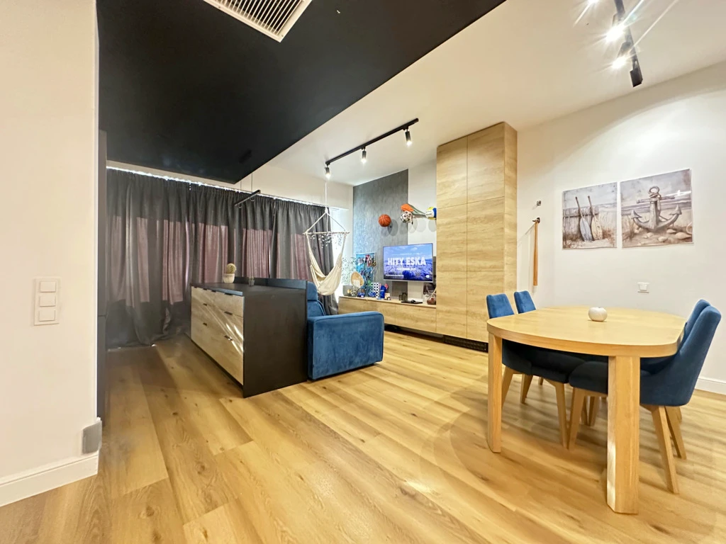 Entdecken Sie dieses stilvoll eingerichtete 2-Zimmer-Apartment im 8. Stock des prestigeträchtigen Hanza Tower in der Innenstadt von Stettin.