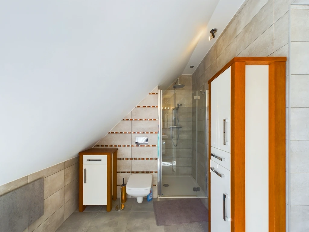 - Badezimmer: 1 – ausgestattet mit Badewanne, Dusche und Waschbecken