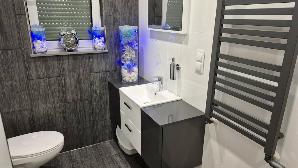 - Badezimmerausstattung: WC, Waschtisch, Dusche, Handtuchheizkörper, Fenster