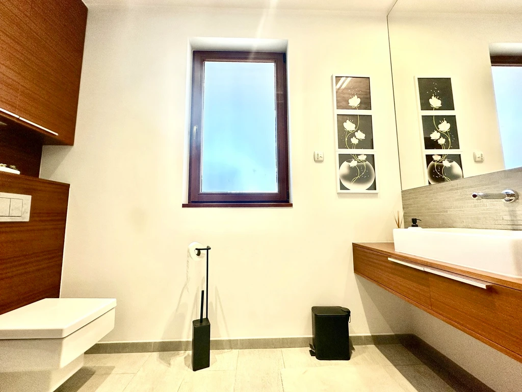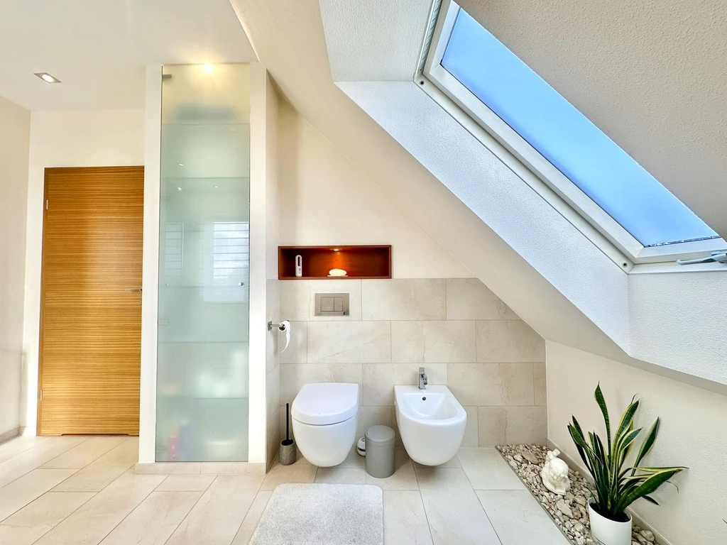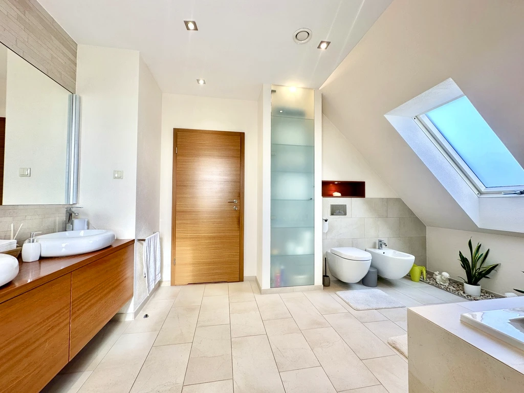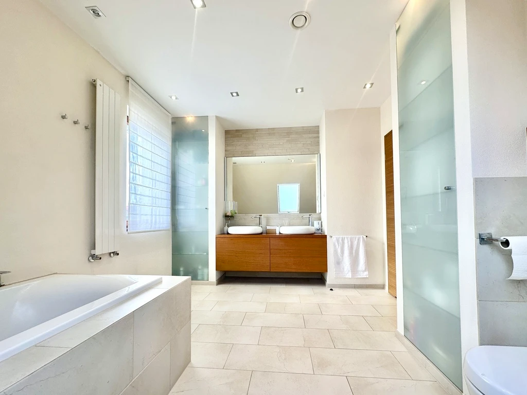 - Badezimmer: 2 (6 m² und 14 m²), ausgestattet mit Dusche, Badewanne, Waschbecken, WC, Fenster, Handtuchheizkörper