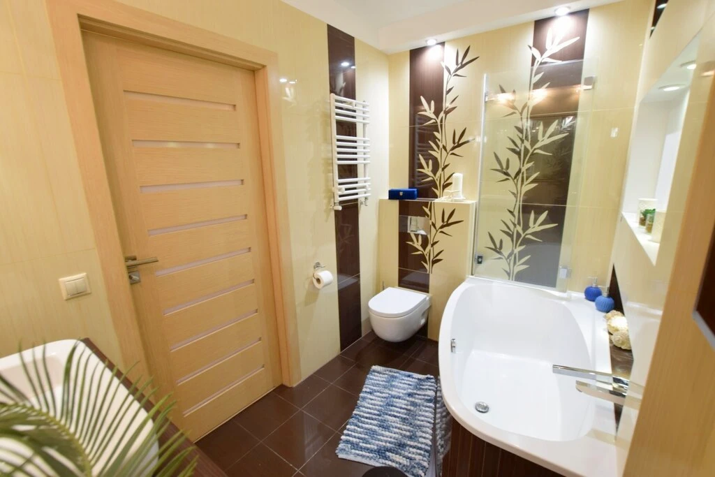 Helles Badezimmer mit Komfort: Mit Badewanne, Toilette und stilvoller Fliesengestaltung bietet das Badezimmer alles für den täglichen Komfort.