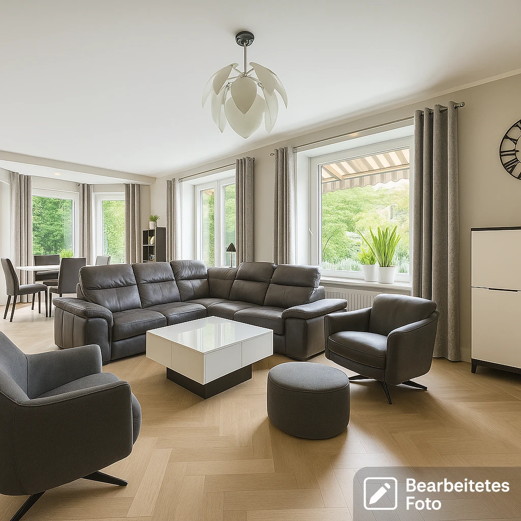- Geräumiges Wohnzimmer mit Essbereich und direktem Zugang zur Terrasse und Garten