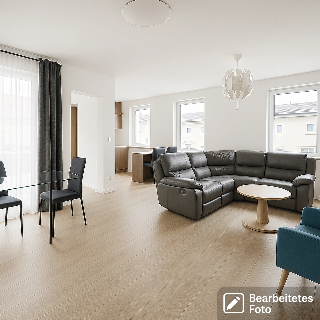 - Geräumiges Wohnzimmer (36 m²) mit offener Küche (7,5 m²)