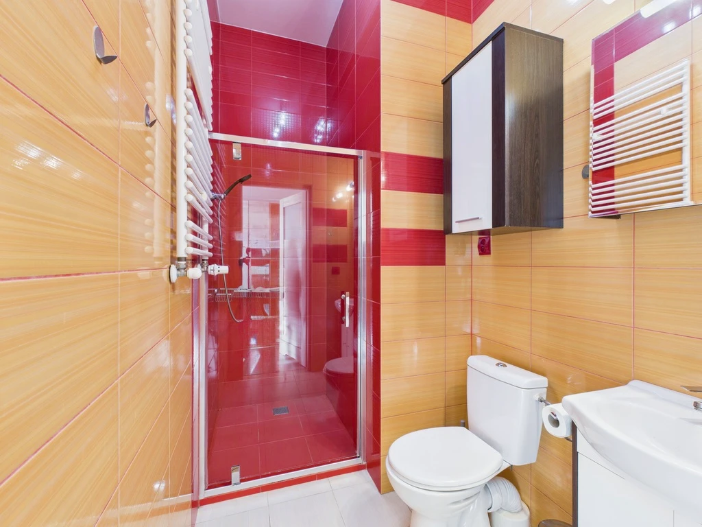 - Badezimmer – ausgestattet mit Dusche, Waschbecken, WC, Handtuchheizung und Waschmaschine.