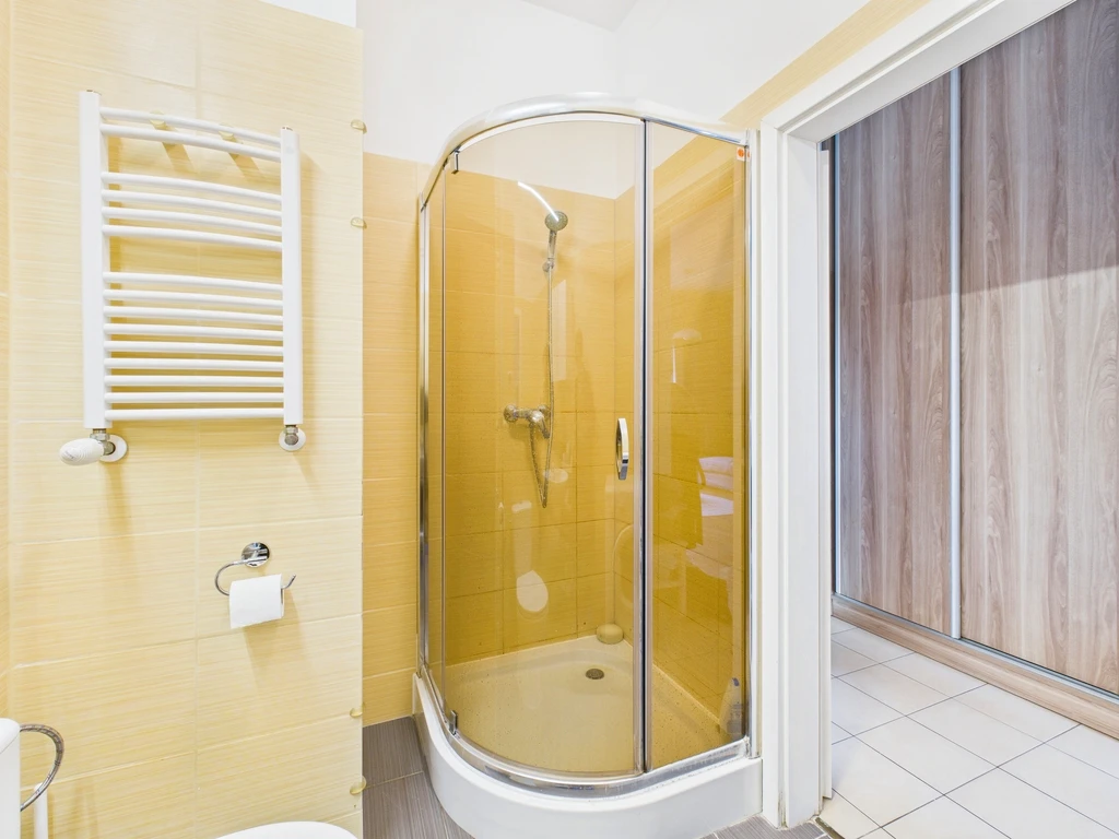 - Modernes Badezimmer mit Dusche, Waschbecken, WC und Handtuchheizkörper