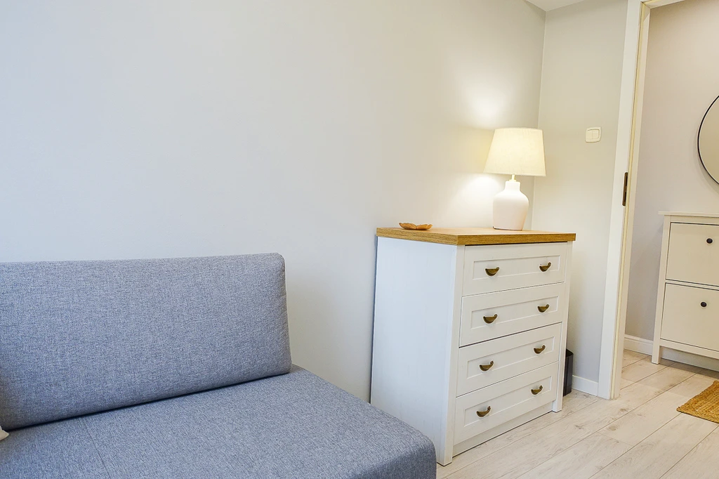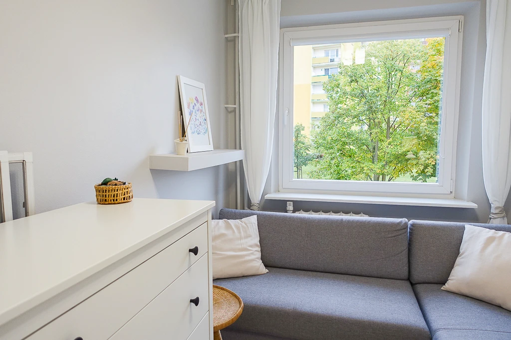 - Wohnzimmer mit Balkon (16 m²): Geschmackvoll als Entspannungsbereich eingerichtet, mit Zugang zum sonnigen Balkon mit Ausblick auf angrenzende Bäume und ein kleines See – der perfekte Ort für den morgendlichen Kaffee!