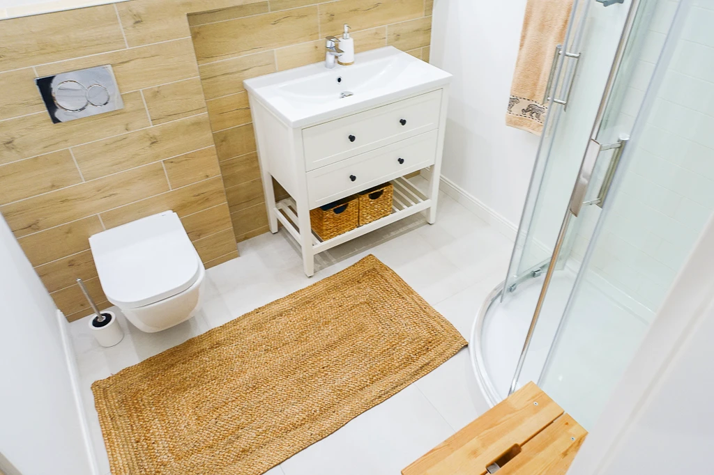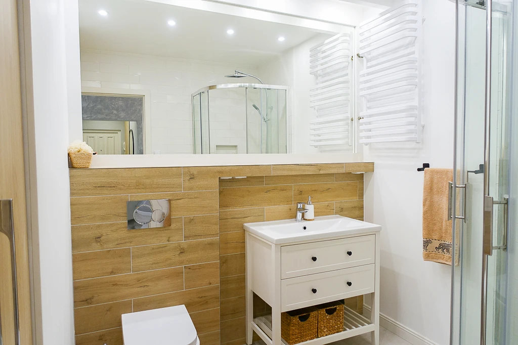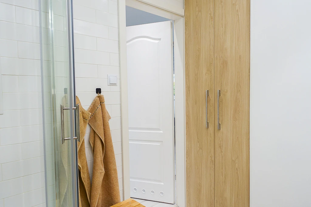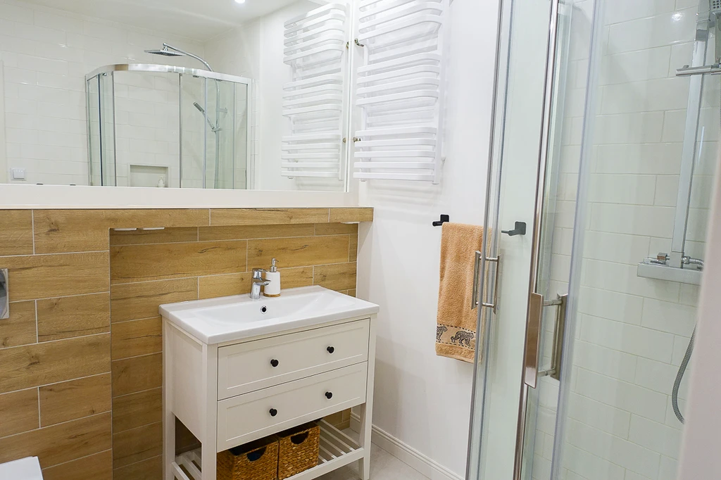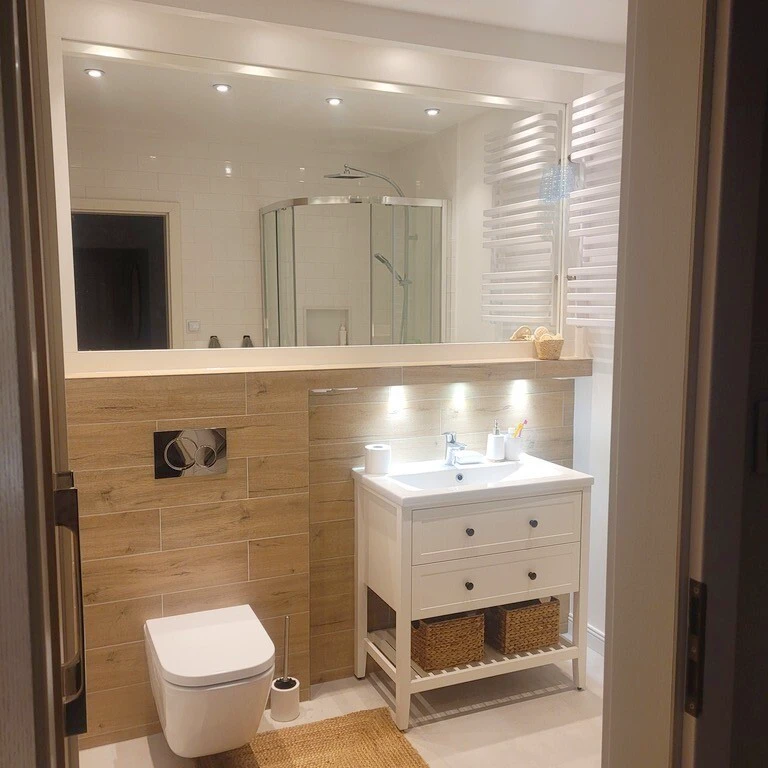 - Badezimmer (4,7 m²): Komplett modernisiert mit großzügiger Dusche, WC mit GEBERIT-System, großem Spiegel, Waschbecken mit Unterschrank und einer integrierten Waschmaschine sowie Einbauregalen für Handtücher und Haushaltsartikel. Platz für einen Trockner vorhanden.
