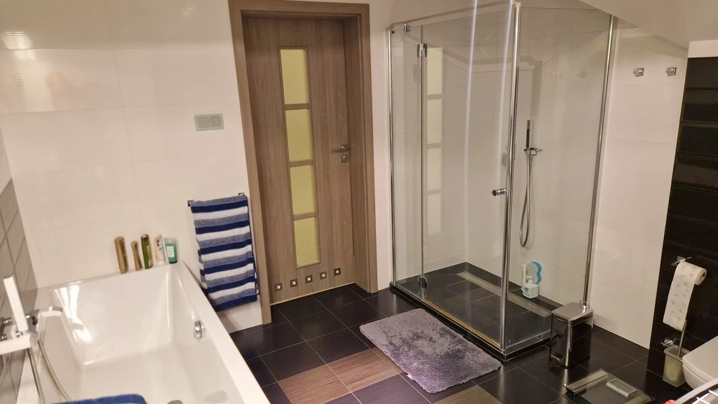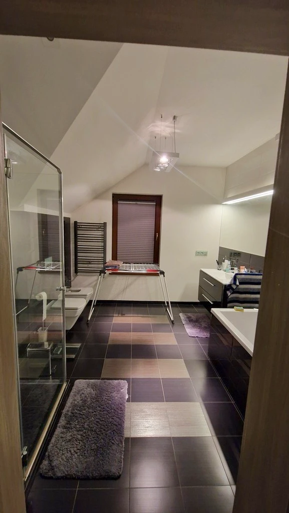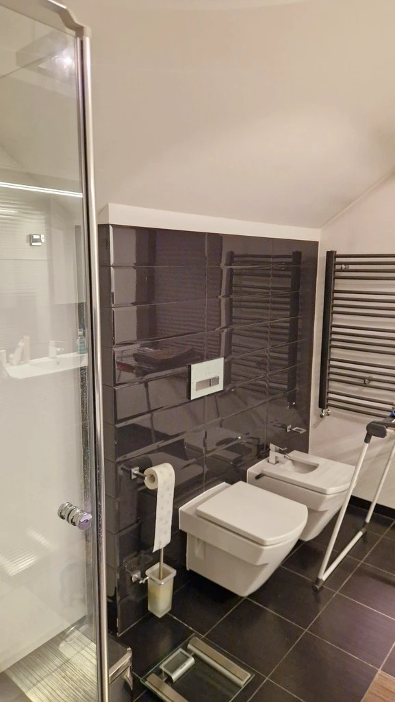 - Modernes Badezimmer mit Fenster, Dusche, Badewanne, Bidet, WC und Handtuchheizkörper