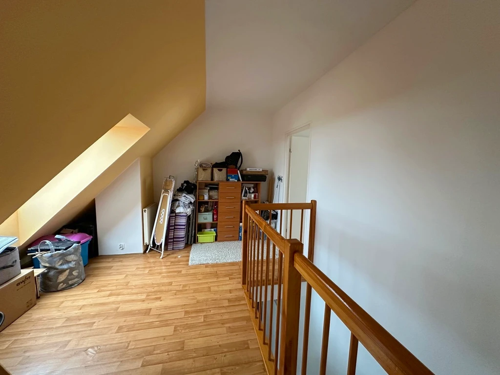 Über elegante Holztreppen gelangen Sie ins Obergeschoss. Hier wurde bereits ein großzügiges Zimmer mit angrenzendem Ankleideraum geschaffen. Der offene Bereich des Flurs eignet sich ideal als Gästezimmer, Arbeitsbereich oder Stauraum nach Ihren individuellen Bedürfnissen. Ebenfalls auf dieser Ebene: ein geräumiges Badezimmer mit Badewanne und Waschmaschine.