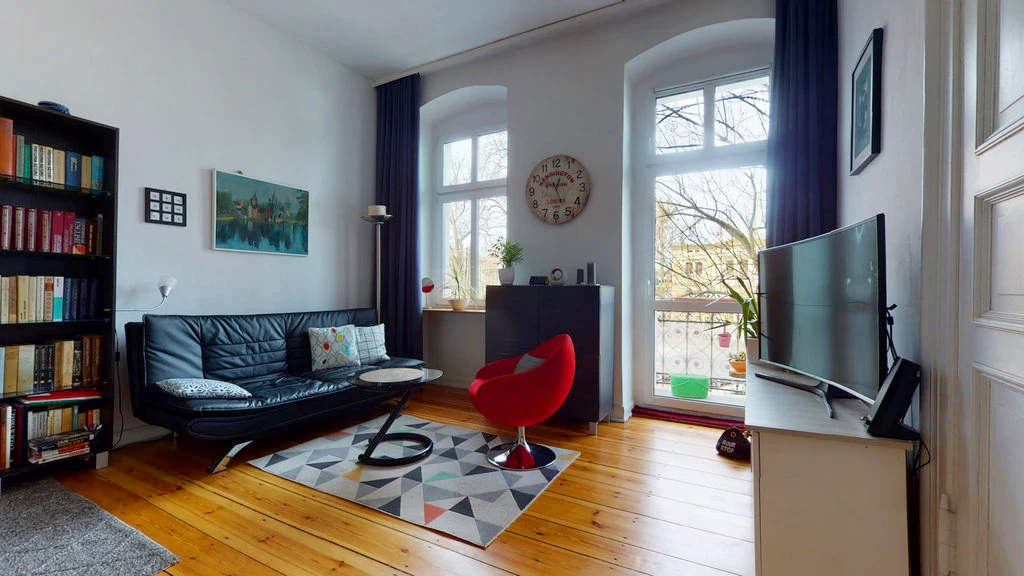 Die zwei prächtigen Wohnräume vorn sind mit doppelflügeligen Türen und originaler Holzverkleidung verbunden – stilvoll, geräumig und gut nutzbar. Vom ersten Wohnraum aus gelangen Sie zum Balkon, der kürzlich komplett saniert wurde.