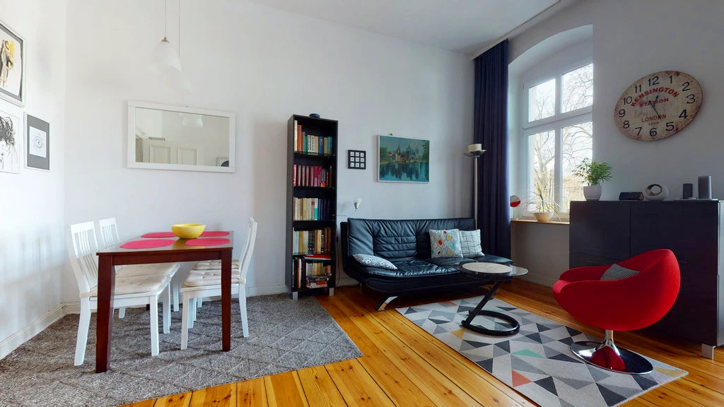 Beheizt wird die Wohnung sowie das Wasser durch eine neue Gastherme der Marke Junkers. Die Fußböden sind mit Laminat ausgelegt; im Wohnzimmer mit Balkon wurden die originalen Holzdielen freigelegt und liebevoll restauriert.