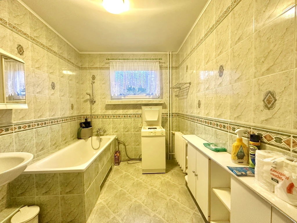 - Badezimmer mit Badewanne, Waschmaschine, Fenster und WC