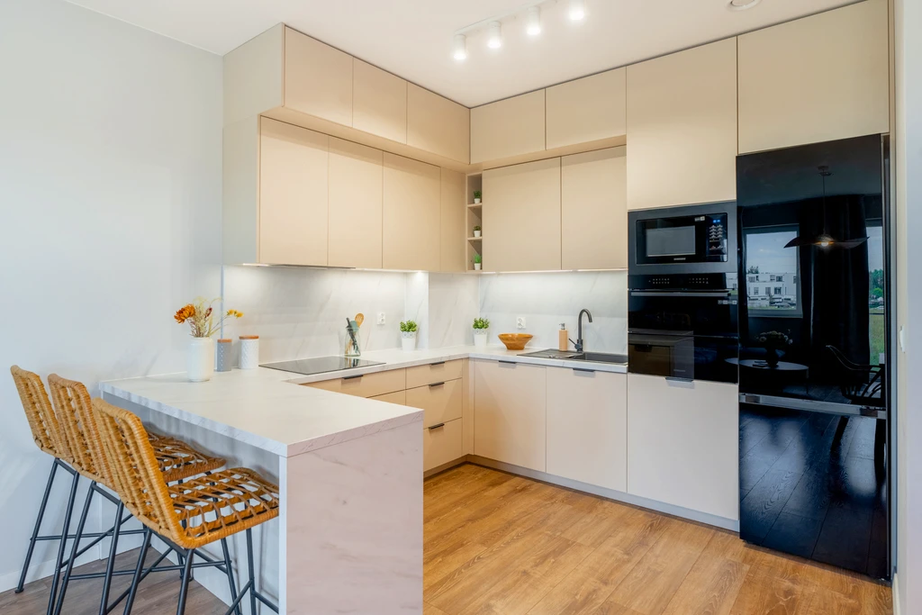 - Moderne Einbauküche mit Elektrokochfeld, Backofen, Geschirrspüler, Kühlschrank und Mikrowelle
