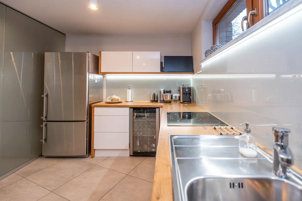 Das Herzstück des Hauses ist das luftige Wohnzimmer mit einem freistehenden Kamin und gemütlichen Samtsofas. Die offene Küche in elegantem Weiß und Naturholz ist nahtlos mit dem Essbereich verbunden – ideal für gesellige Abende!