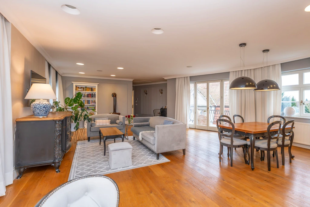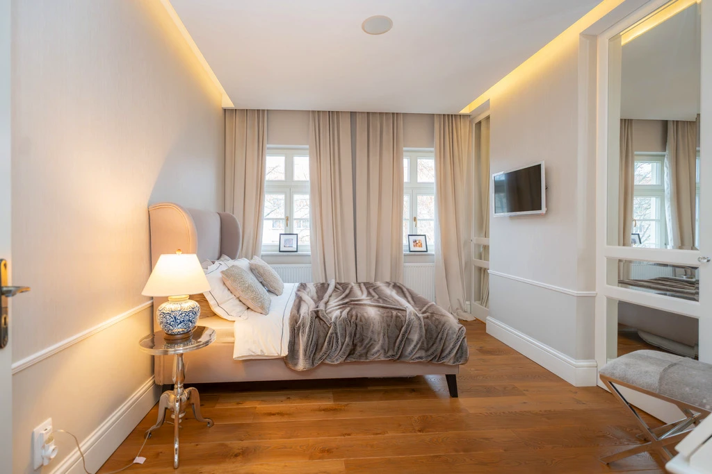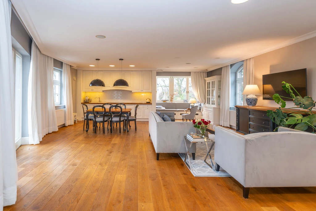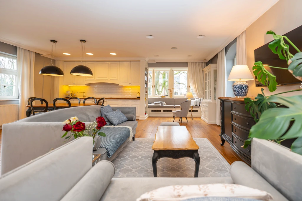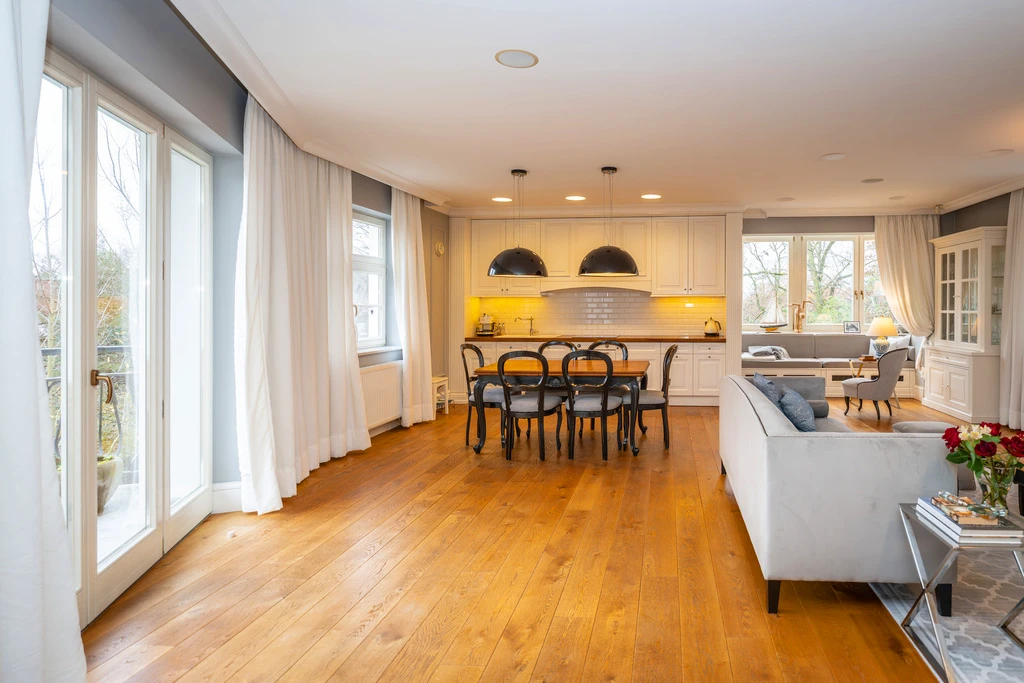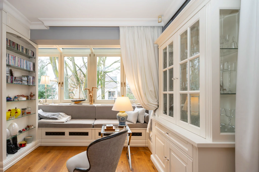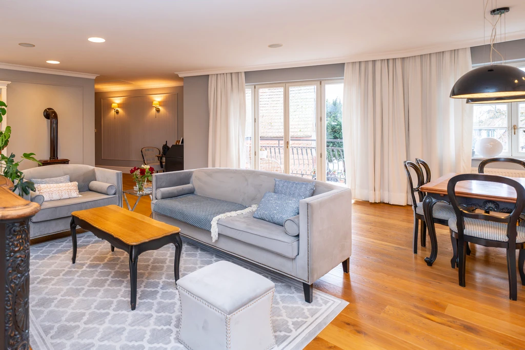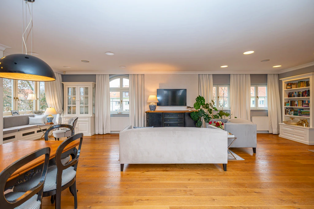Die Innenräume sind in einem zeitlosen „Modern Classic“-Stil mit einem Hauch von Art déco gestaltet. Eine stilvolle Farbpalette aus Grau-, Beige- und Grüntönen schafft in Verbindung mit dunklen Akzenten ein elegantes, aber wohnliches Ambiente. Große, symmetrisch platzierte Fenster sorgen für viel Tageslicht und unterstreichen die klassische Fassadengestaltung mit weißen Stuckelementen.