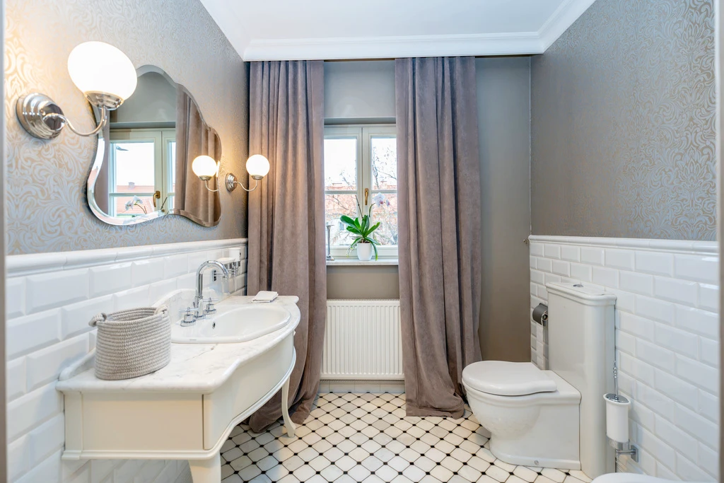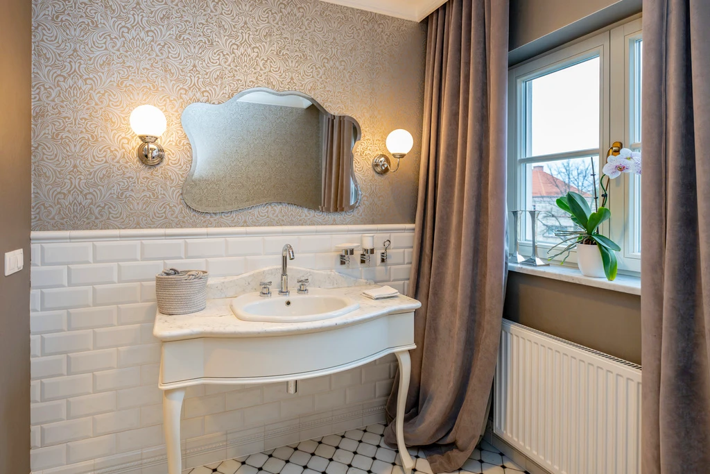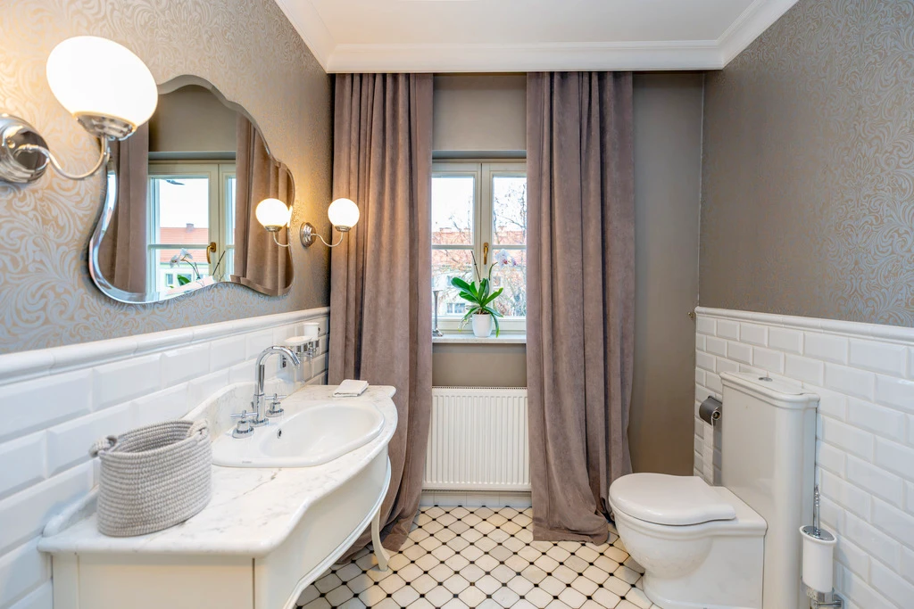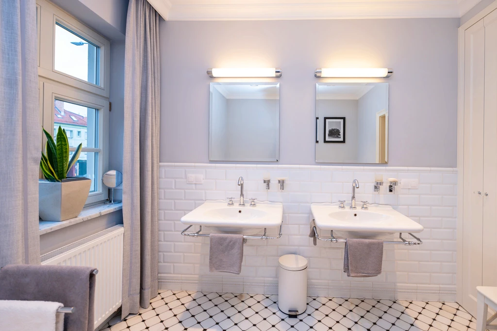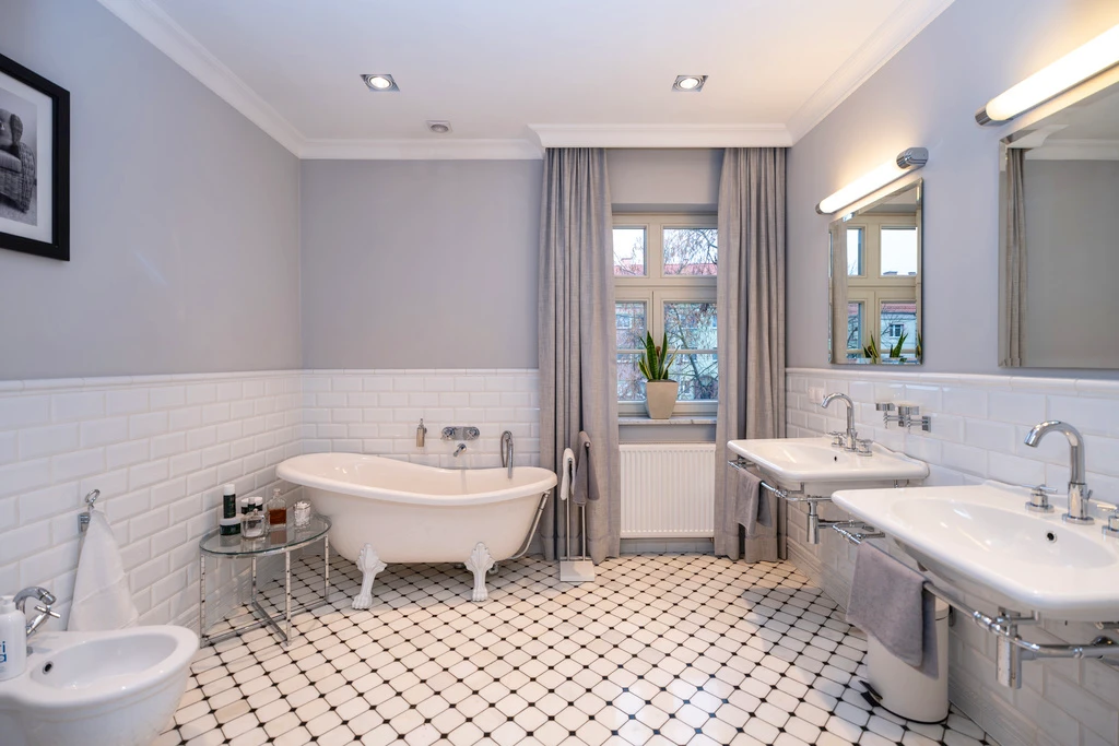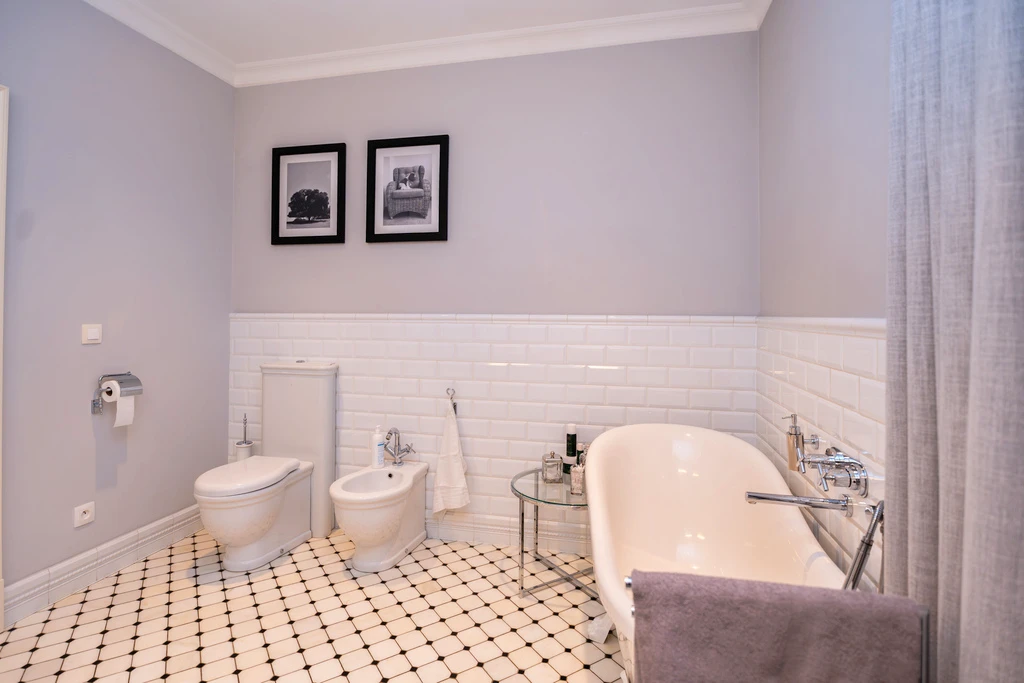 Die vier stilvollen Badezimmer sind mit hochwertigen Materialien wie Marmor und Retro-Mosaikfliesen gestaltet. Details wie freistehende Badewannen auf Löwenfüßen und klassische Armaturen in Chrom verleihen jedem Bad einen Hauch von Luxus.