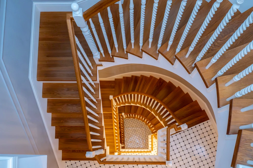 Eines der gestalterischen Highlights ist das geschwungene Holztreppenhaus mit weiß gedrechseltem Geländer – ein architektonisches Schmuckstück!
