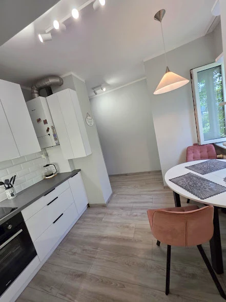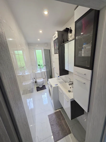 - Separate, helle Küche mit Fenster – ausgestattet mit modernen Einbaumöbeln und allen wichtigen Küchengeräten. Dank der durchdachten Raumaufteilung ist auch Platz für einen Esstisch vorhanden