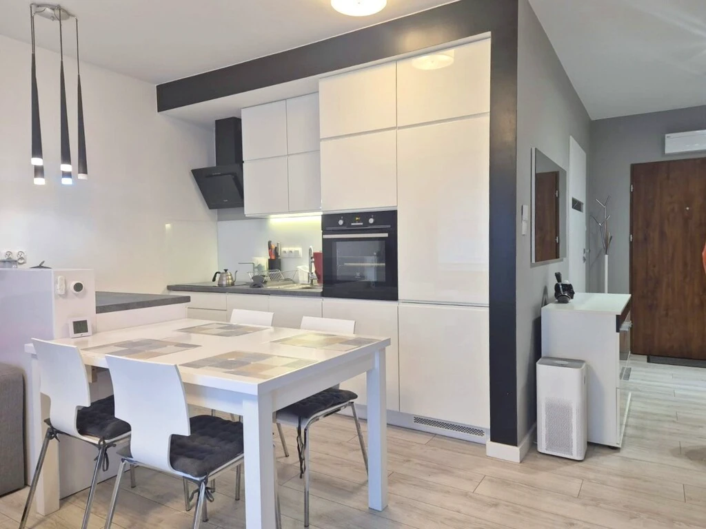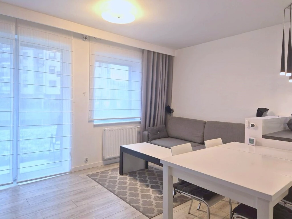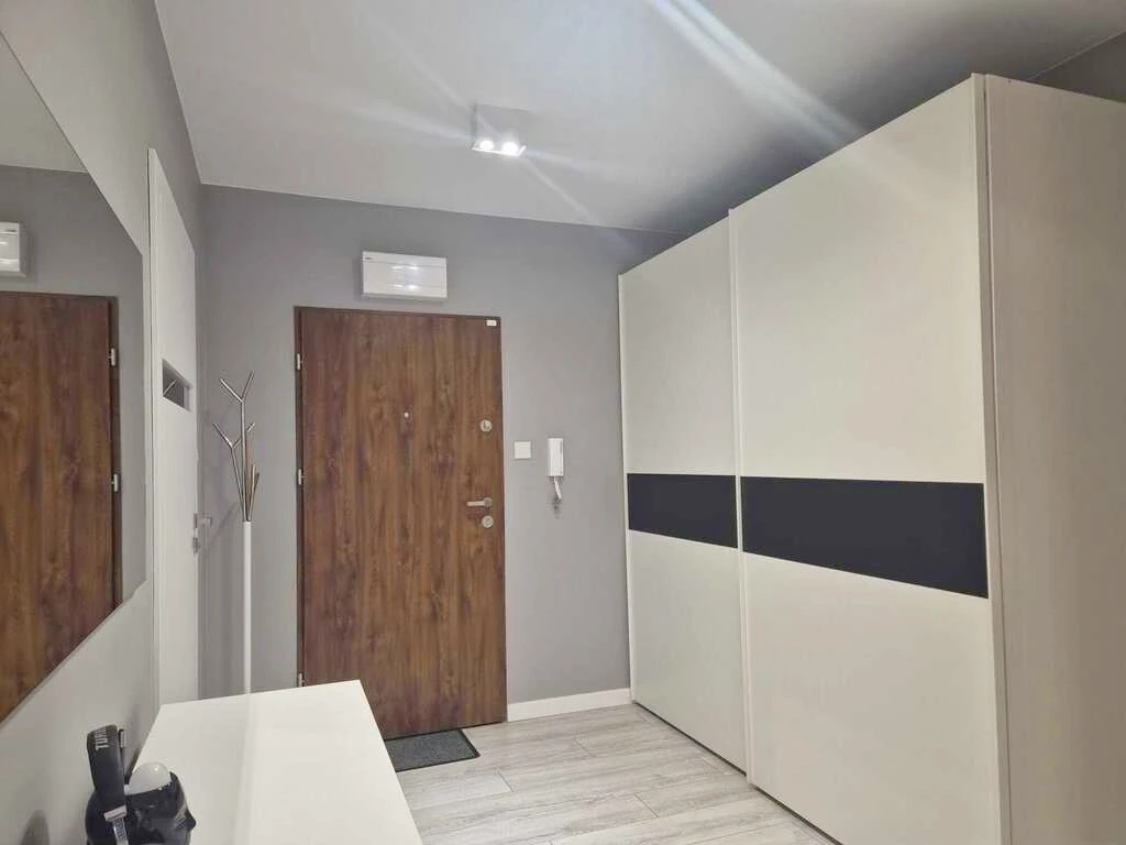 Diese sehr gepflegte Wohnung befindet sich im Erdgeschoss eines modernen Wohnblocks aus dem Jahr 2016 in der beliebten Wohngegend Gumieńce.