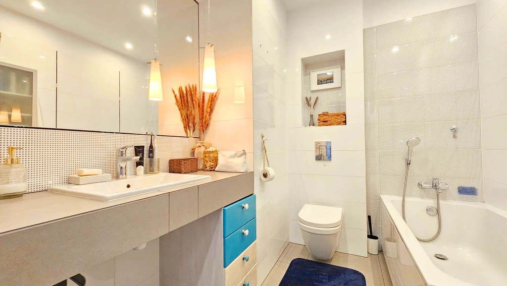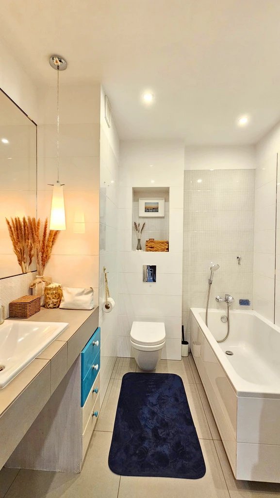 Das Badezimmer sorgt mit geschmackvollen Details für Wohlbefinden. Eine komfortable Badewanne, ein großer Waschtisch, Platz für eine Waschmaschine – hier beginnt und endet der Tag mit Stil.