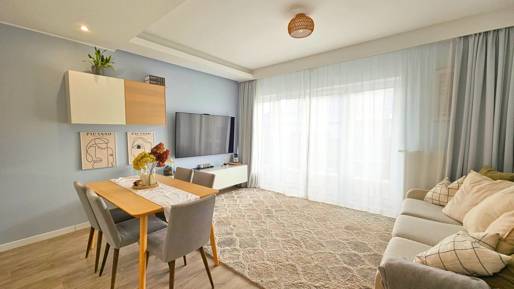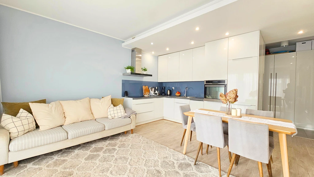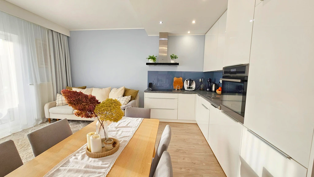 Die Wohnung wurde mit viel Liebe zum Detail gestaltet, sodass jeder Quadratmeter sinnvoll genutzt wird. Der Lebensmittelpunkt ist das helle Wohnzimmer mit offener Küche – ein freundlicher Raum für Morgendkaffee, gesellige Abende und gemeinsames Kochen. Die voll ausgestattete Einbauküche mit Kühlschrank, Herd, Backofen und Geschirrspüler macht das Kocherlebnis perfekt.