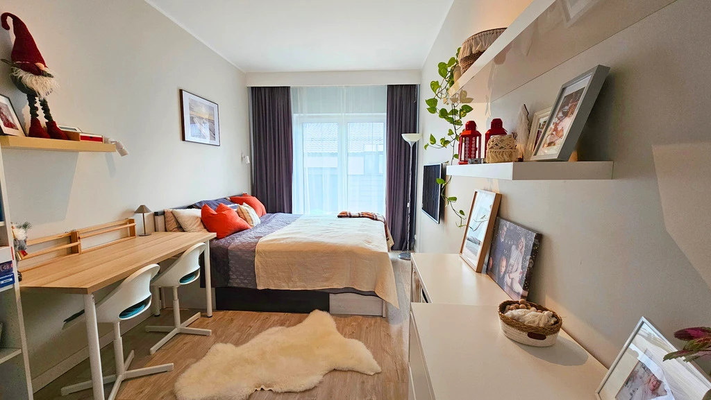 Das Schlafzimmer ist vielseitig nutzbar: ausreichend Platz für ein großes Bett, Schreibtisch und sogar einen gemütlichen Kinderbereich – ein Raum, der sich Ihren Bedürfnissen anpasst.