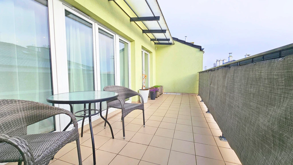 Vom Wohnzimmer und Schlafzimmer gelangt man direkt auf die großzügige, südlich ausgerichtete Loggia – ein Highlight dieser Immobilie. Sie bietet genügend Platz für Pflanzen, Entspannung und laue Sommerabende.