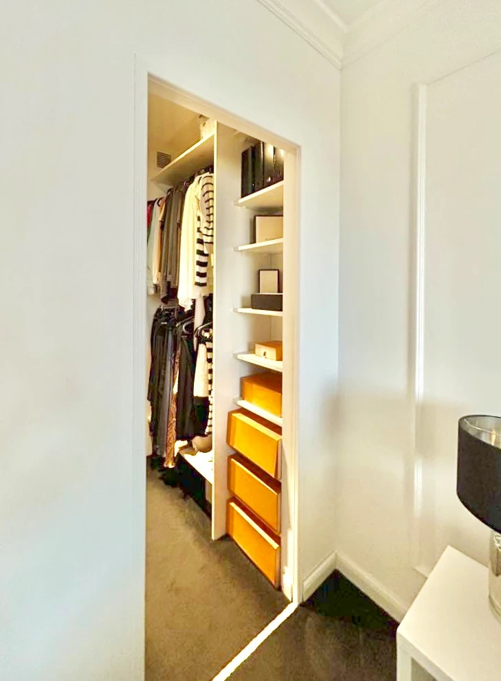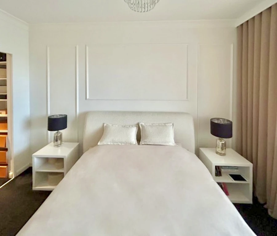Die stilvolle Schlafzimmer-Oase inklusive begehbarem Kleiderschrank ist in beruhigenden Farben gehalten und schafft einen perfekten Rückzugsort für erholsame Nächte.